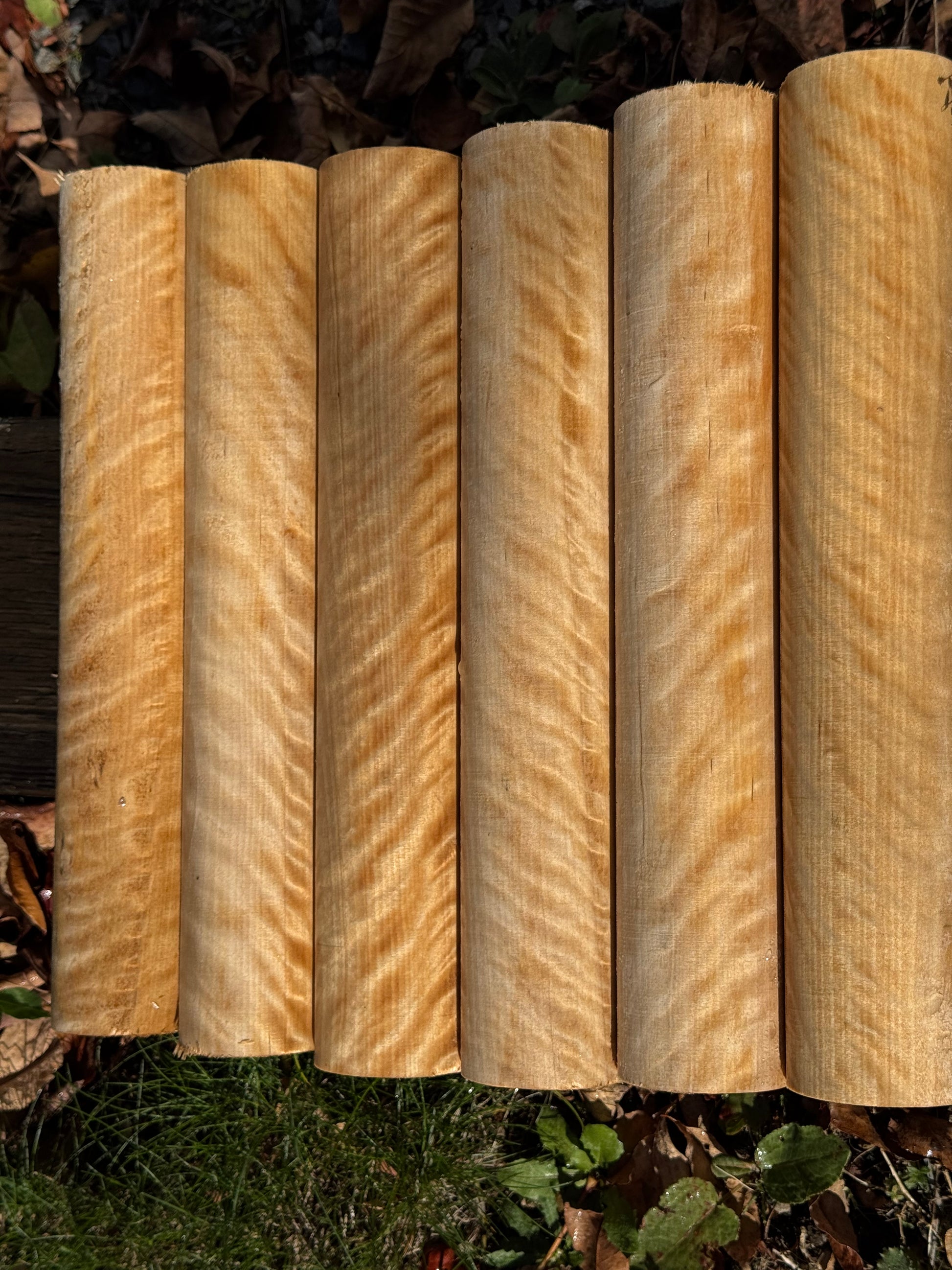 Here are 4 nicely figured New England Flame Birch Turning rounds. These are AAA figured. Rare find! These would make great looking pepper mills. No corners to turn off . They are kiln dried to 10 /12% moisture content and ready for turning. All are free of cracks , knots or defects. They are sure to make a beautiful turnings. They measure just under 2-1/8" diameter and are 12" long. These may contain some minor tear out that will easily turn out. These are hard wood. Photo has been misted with water to show figure.