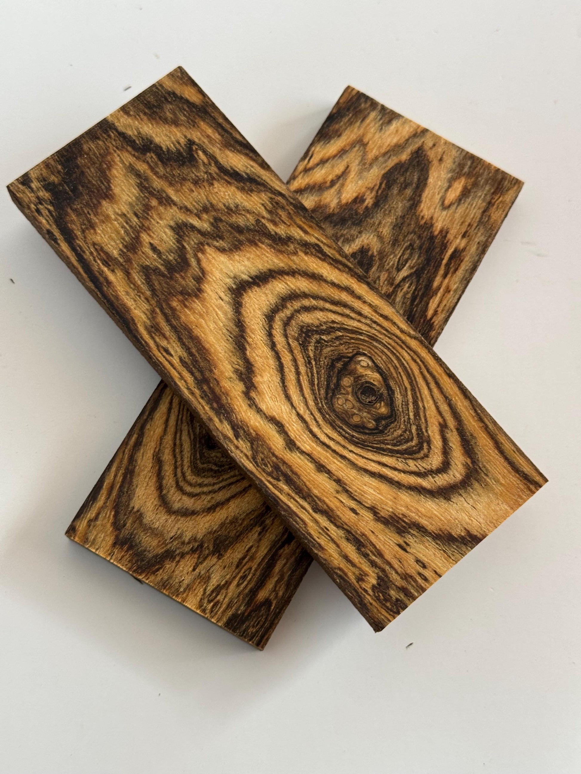 This is a nice book matched set of Exotic wood knife scales of gun grip blanks. These are of as Bocote. This wood has a beautiful grain and nice colors very hard and dense. Both measure 3/8" thick. 2" wide and are 5 1/4 long. These are dry and ready for use.